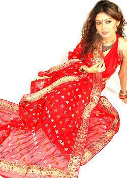 Antique Brocade and Sequin + Bead Zardosi Borders on Red Silk-Georgette Saree with Sequin Highlighted Intricate Gold Print all over - Red Crepe-Silk OR Blue-Gold Brocade Blouse made in style of your choice (Item Code: PC025) US $ 497.00